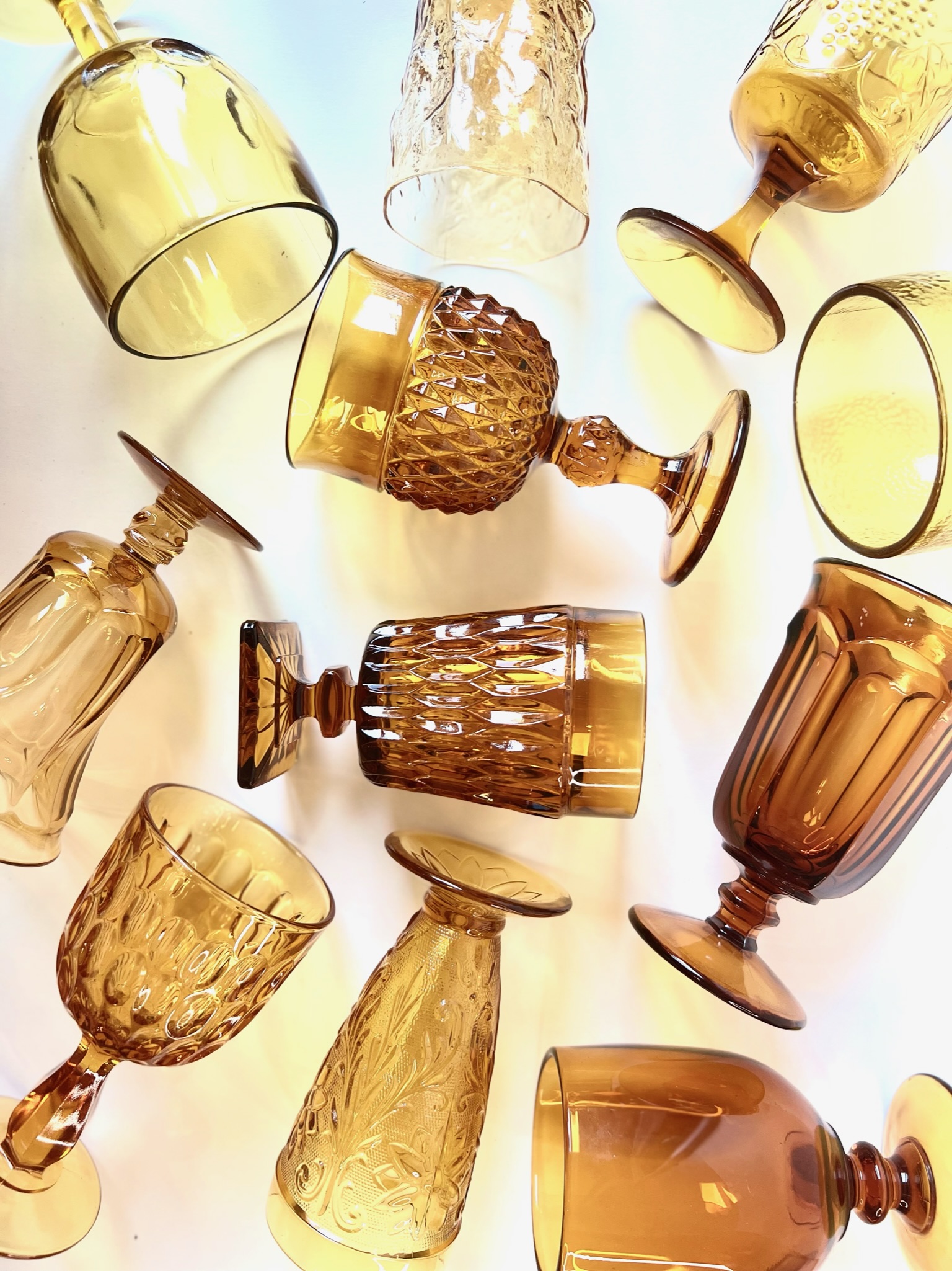 Inventory Gallery Glassware Amber Collection Search View Wishlist Amber Collection Price: $2.00 Description: All Glassware collections are an assortment of water, iced tea, and wine goblets. They range from 5.5 to 7.5 inches in height and can hold between 8.5 to 13 ounces. Add to Wishlist