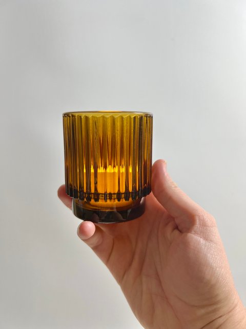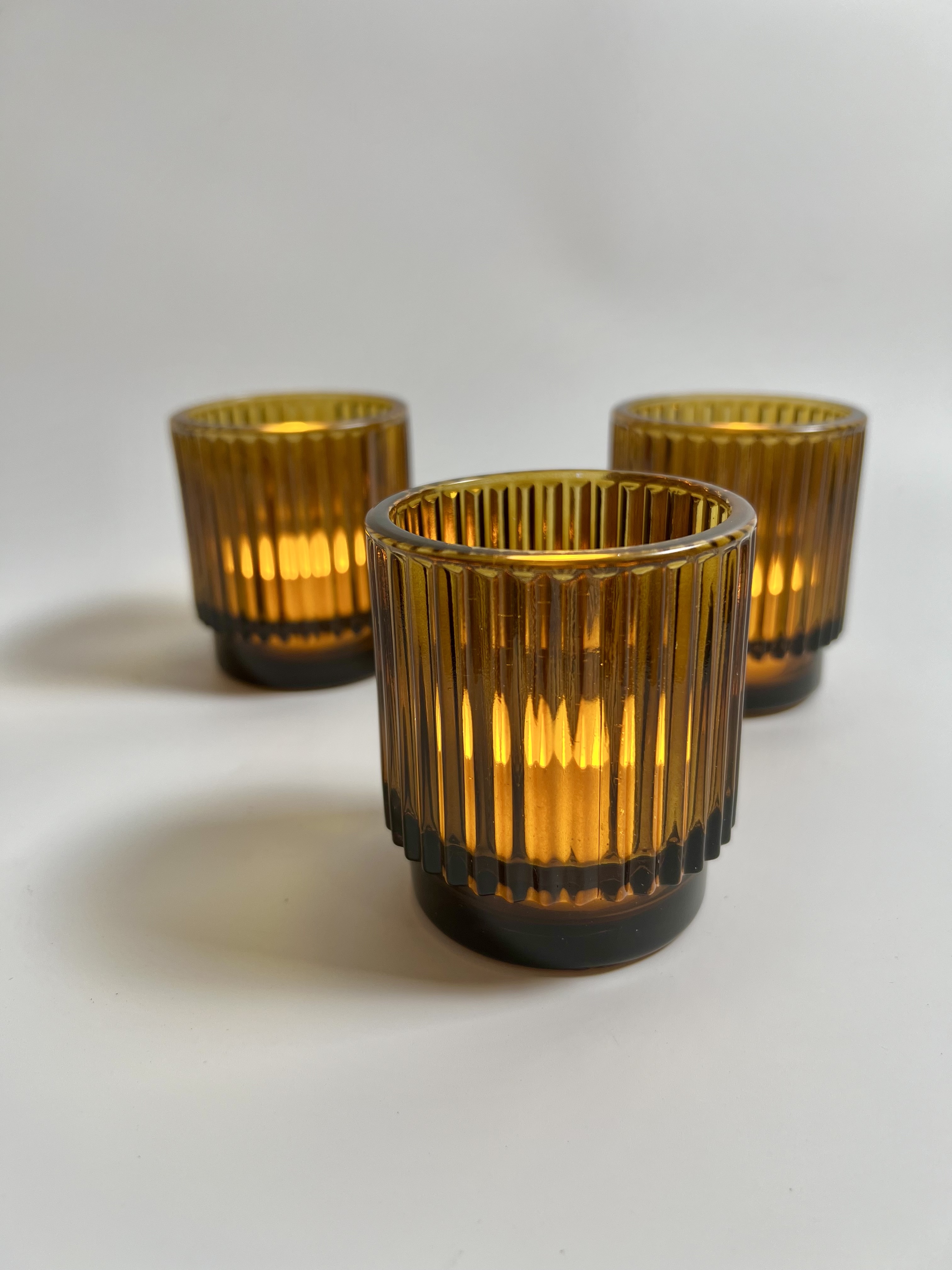 These ribbed votives are high quality and thick glass. They're about 2.6 inches in diameter and 3.2 inches in height, so a bit larger than your average tea light holder.