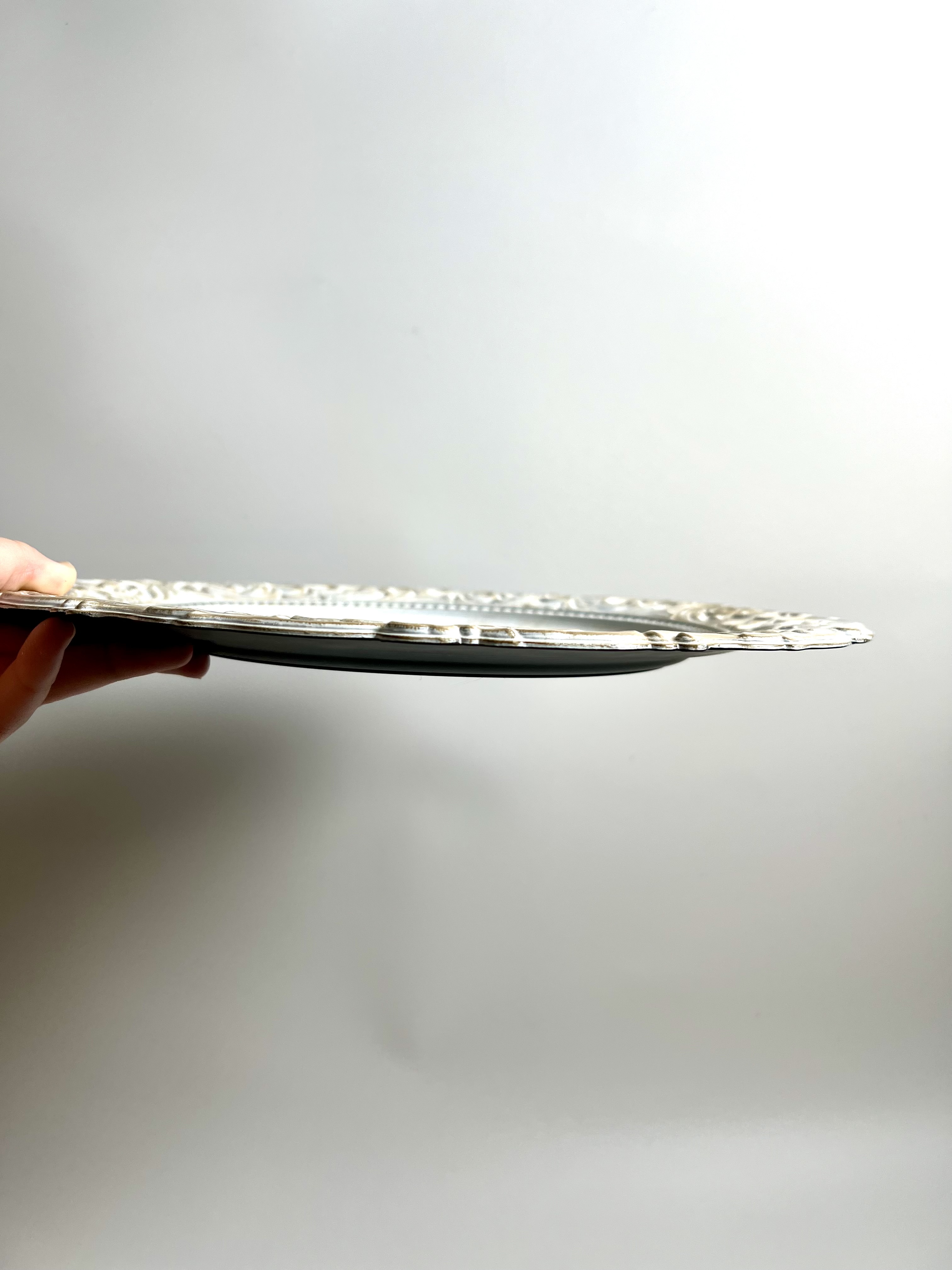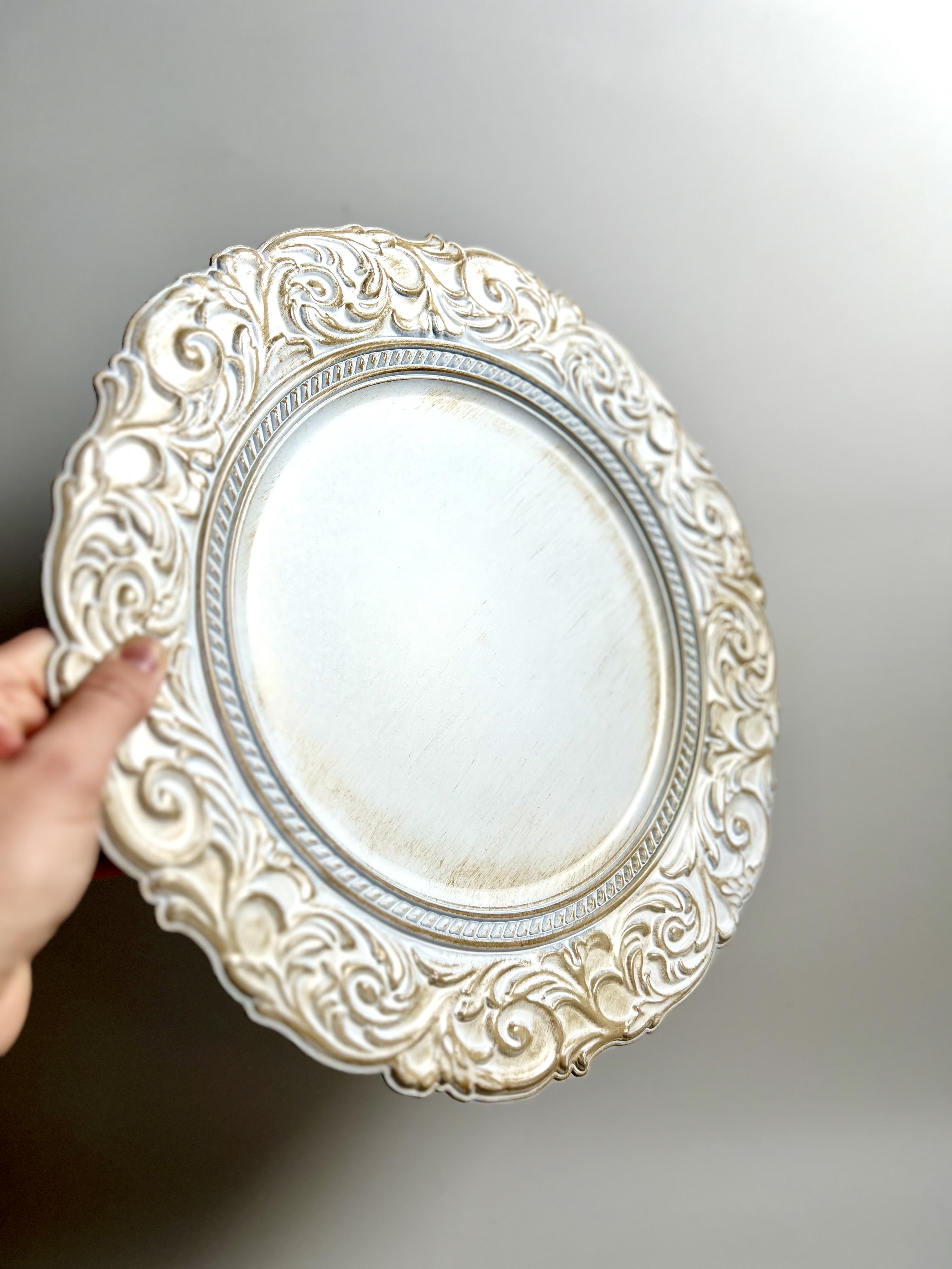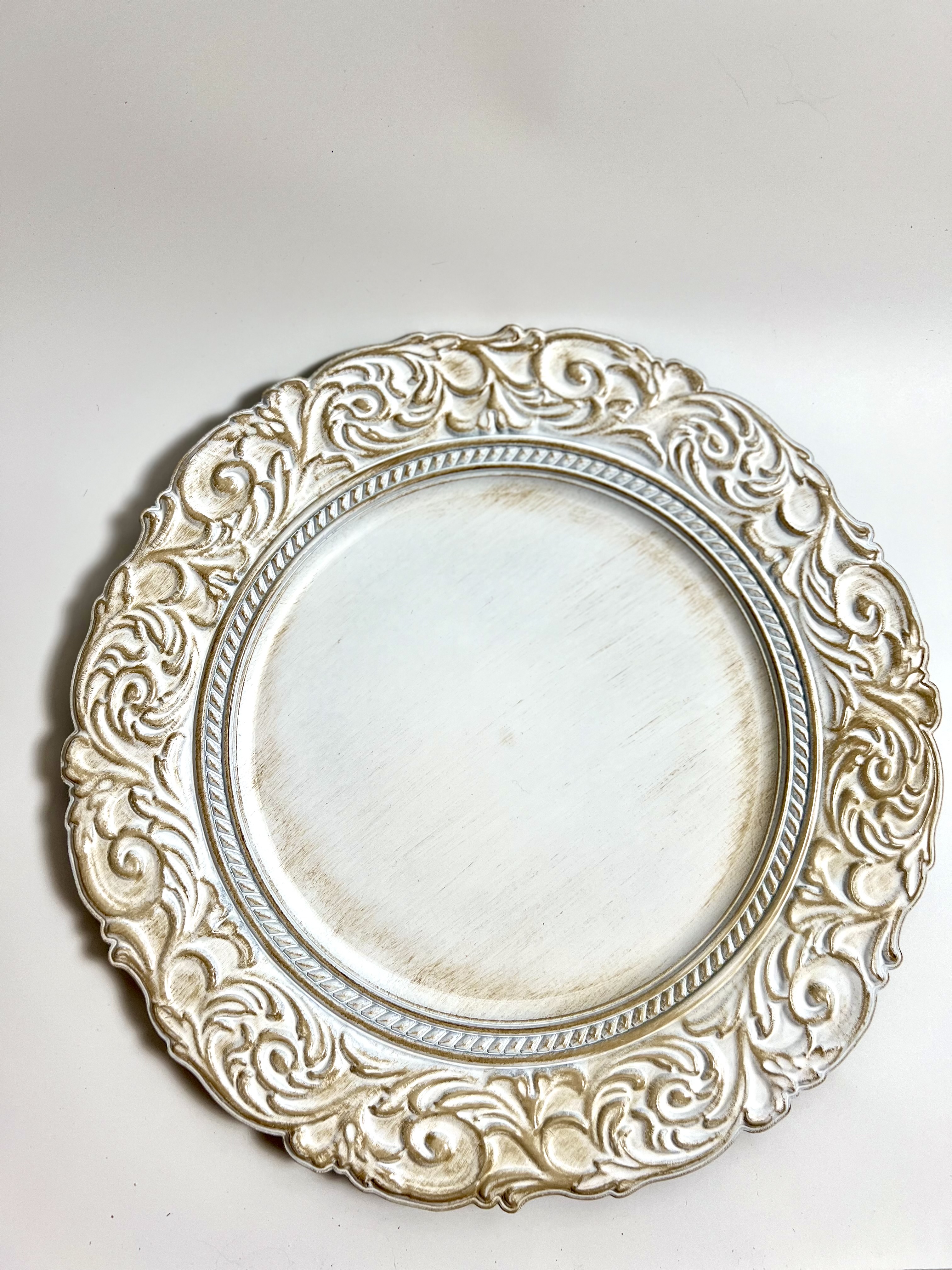 Inventory Gallery Chargers Antique Style White Charger Search View Wishlist Antique Style White Charger Price: $1.50 Description: These chargers are 14 inches in diameter, and have a beautiful ornate engraved rim in a hard plastic. They will be sure to elevate any table Tags: white, charger, white charger, antique style, vintage style Add to Wishlist