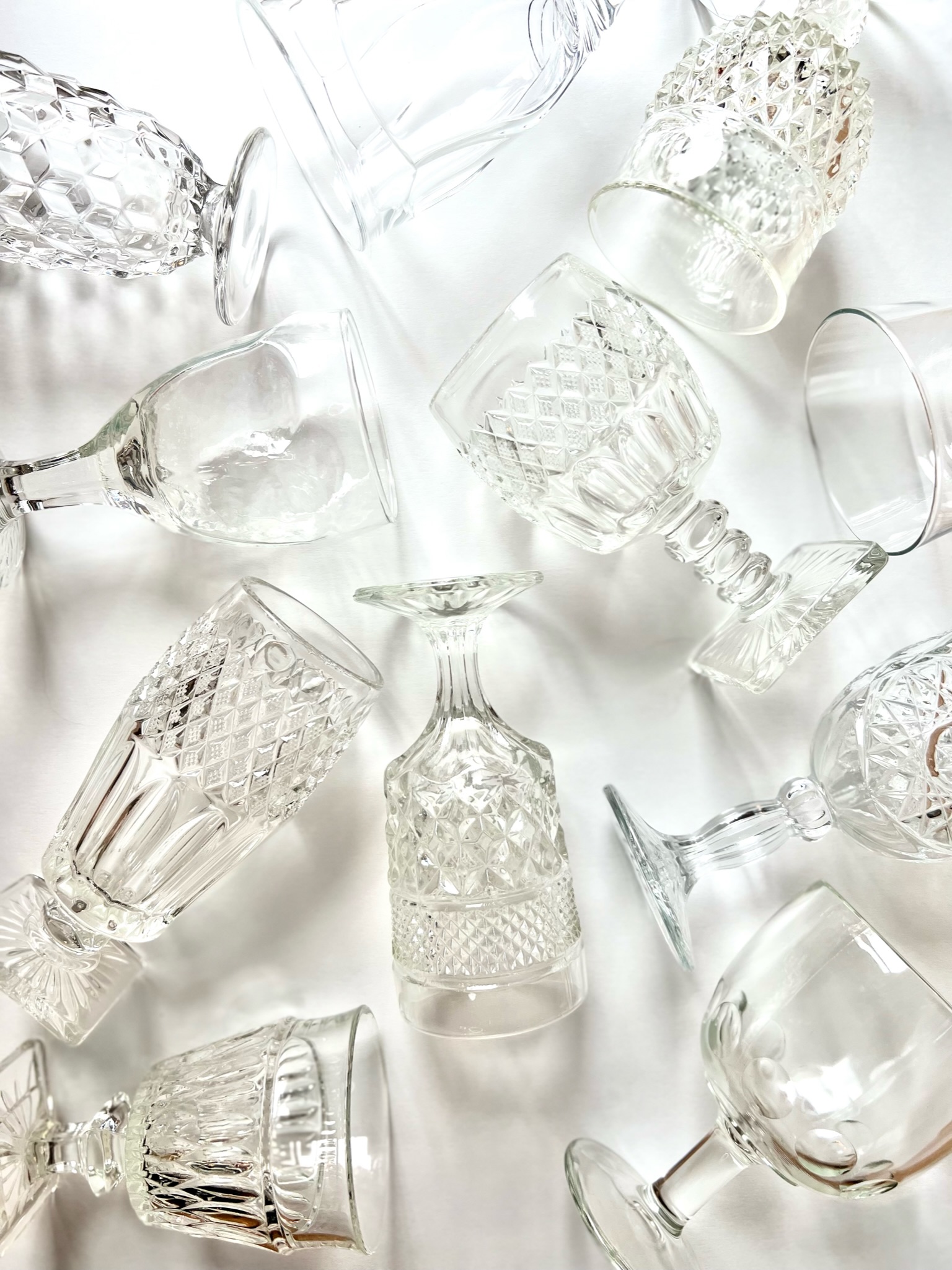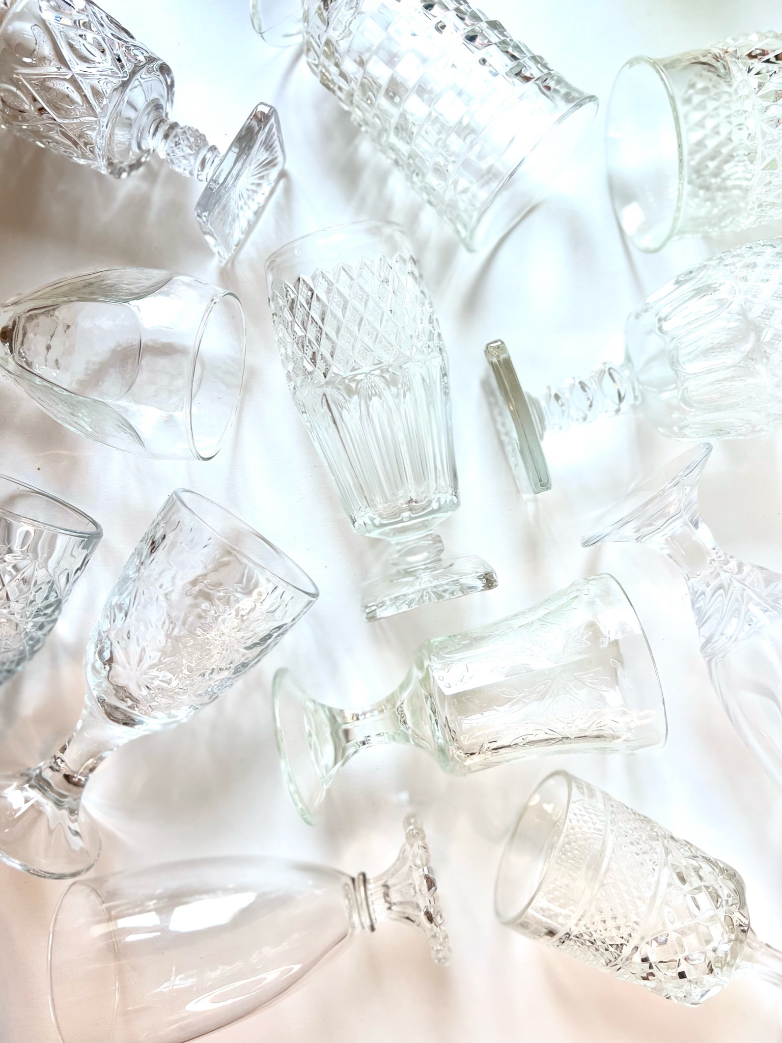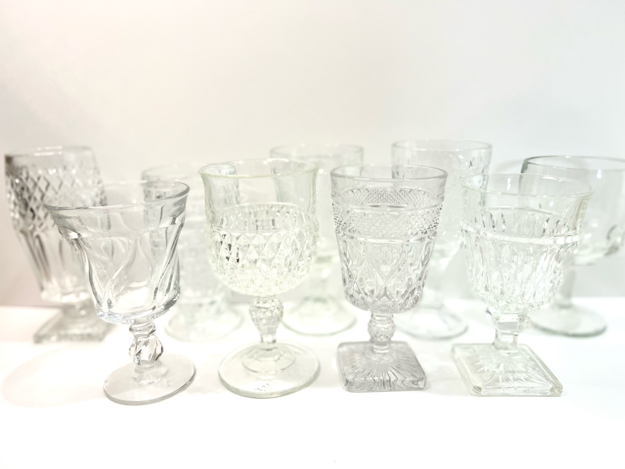 Clear Collection. All Glassware collections are an assortment of water, iced tea, and wine goblets. They range from 5.5 to 7.5 inches in height and can hold between 8.5 to 13 ounces.
