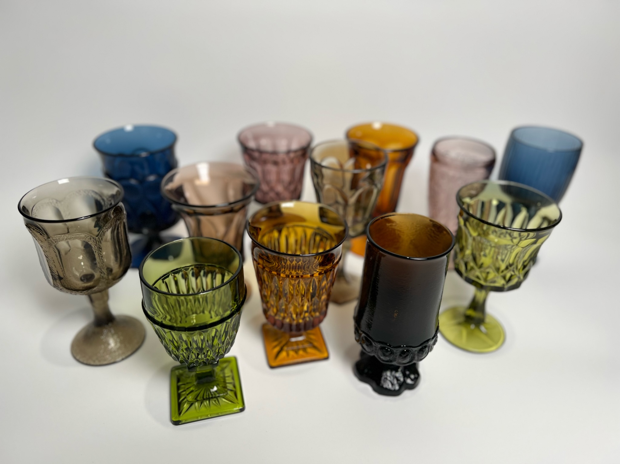 The Dark Rainbow collection includes all our darker colors! Includes dark blue, brown, amber, some greens and purples, and smoke glass. All Glassware collections are an assortment of water, iced tea, and wine goblets. They range from 5.5 to 7.5 inches in height and can hold between 8.5 to 13 ounces.