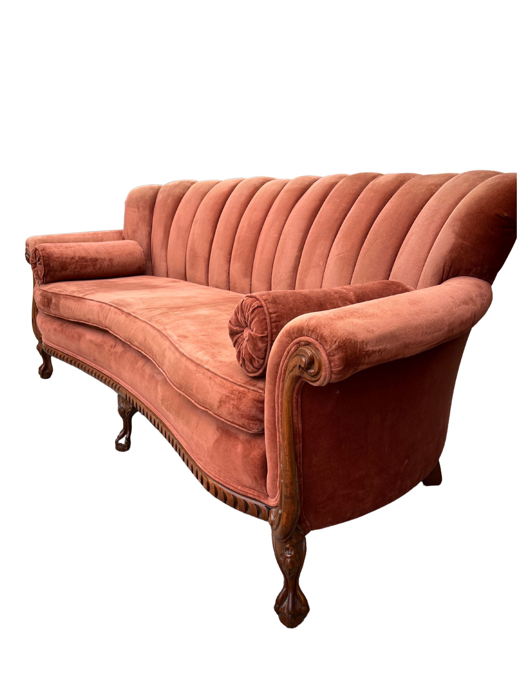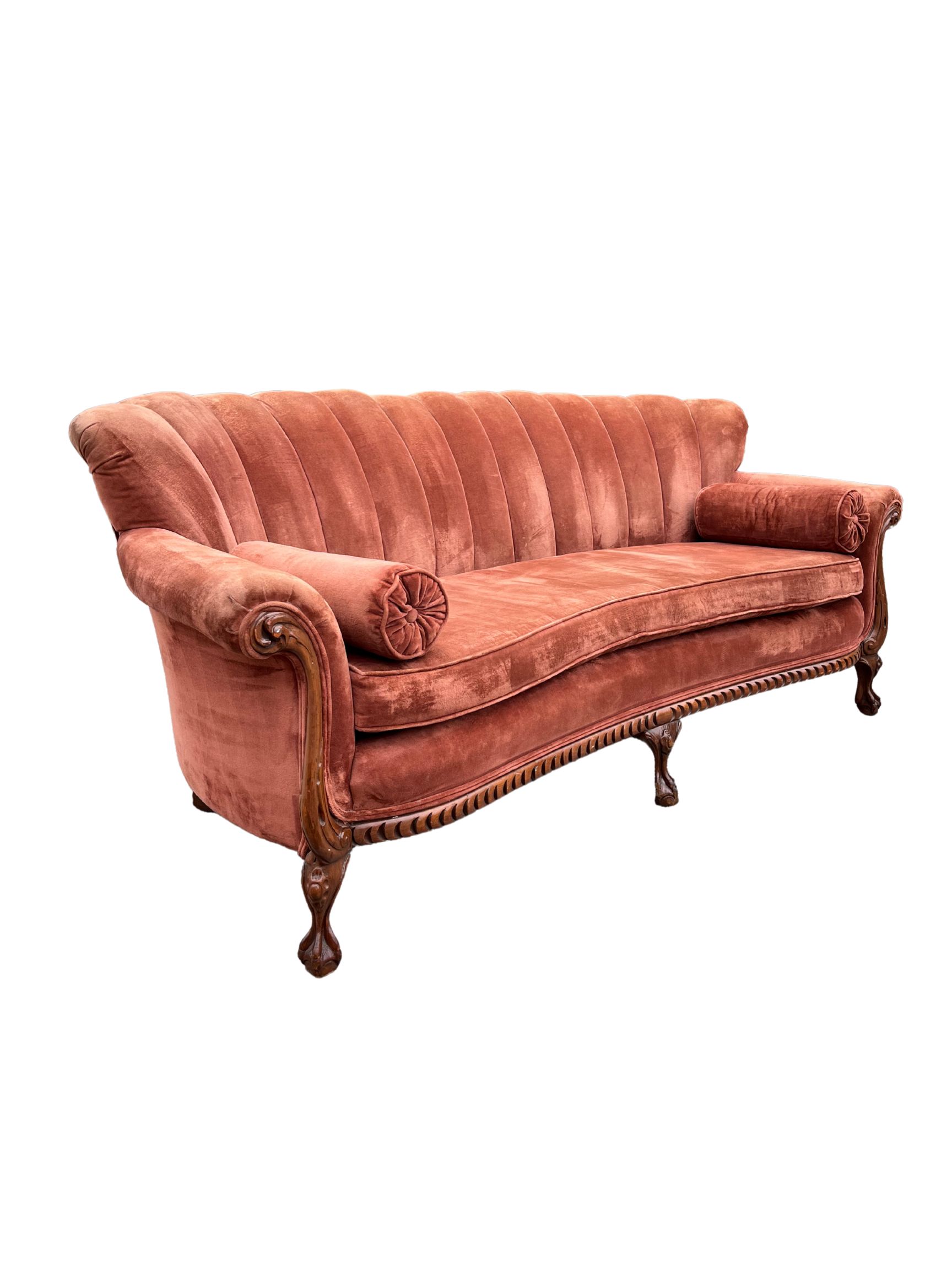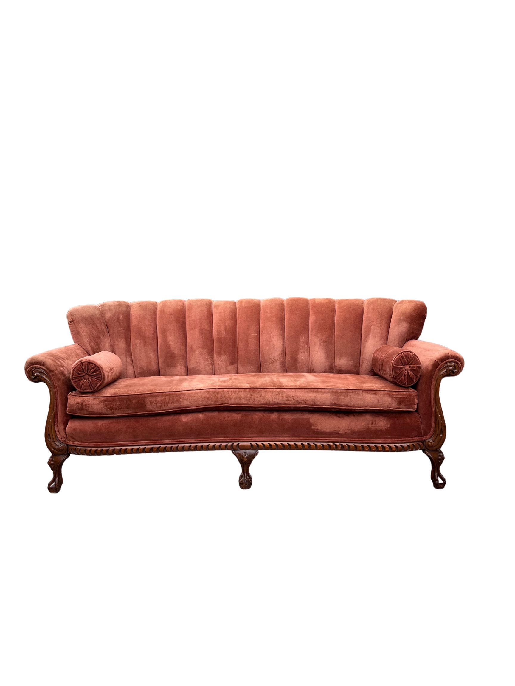 A beautiful mauve color, with a shell back, and sexy wooden legs. This couch is a stunner.
