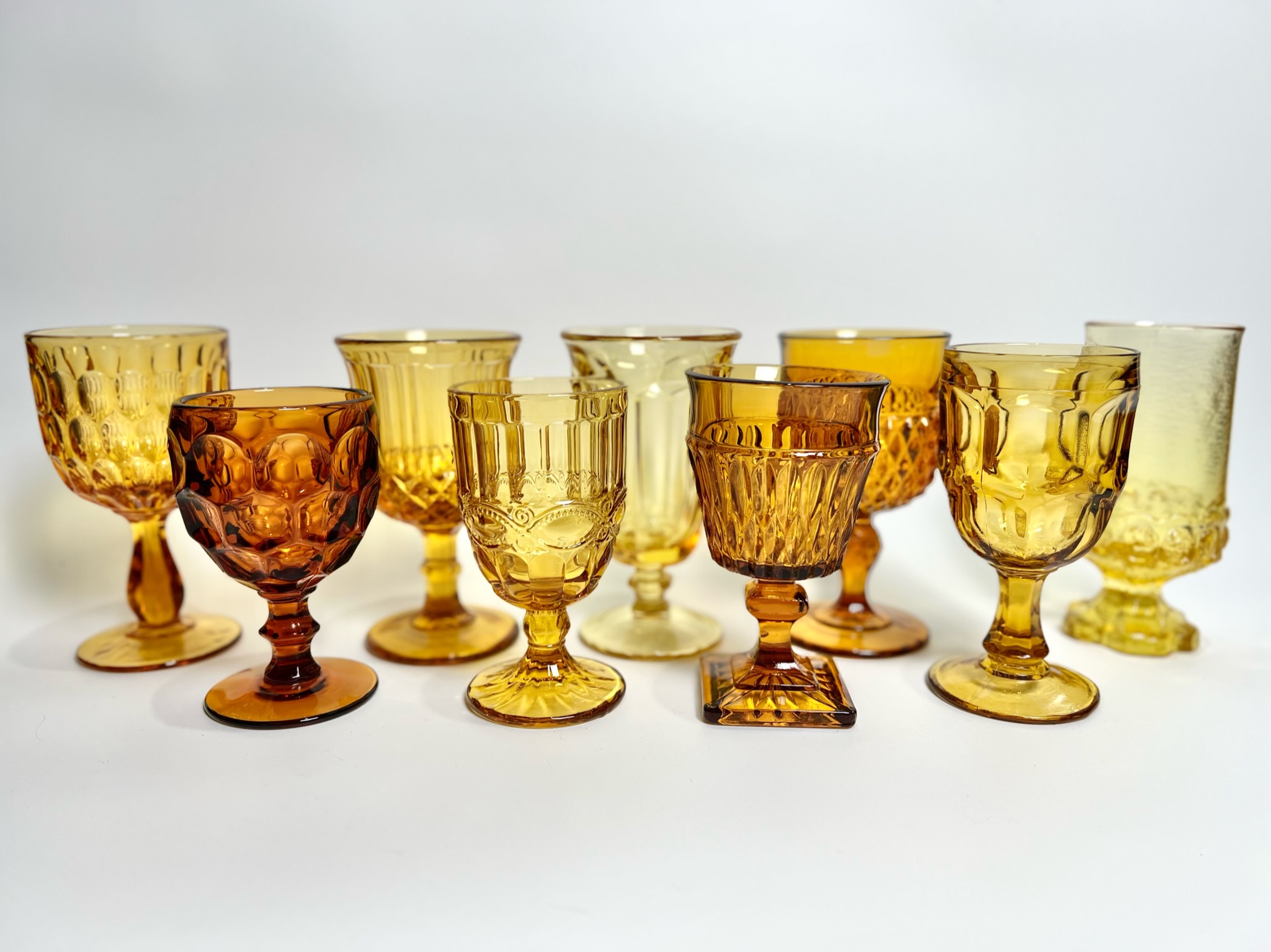The Sunrise collection includes Amber, Honey, and Yellow Goblets. All Glassware collections are an assortment of water, iced tea, and wine goblets. They range from 5.5 to 7.5 inches in height and can hold between 8.5 to 13 ounces.