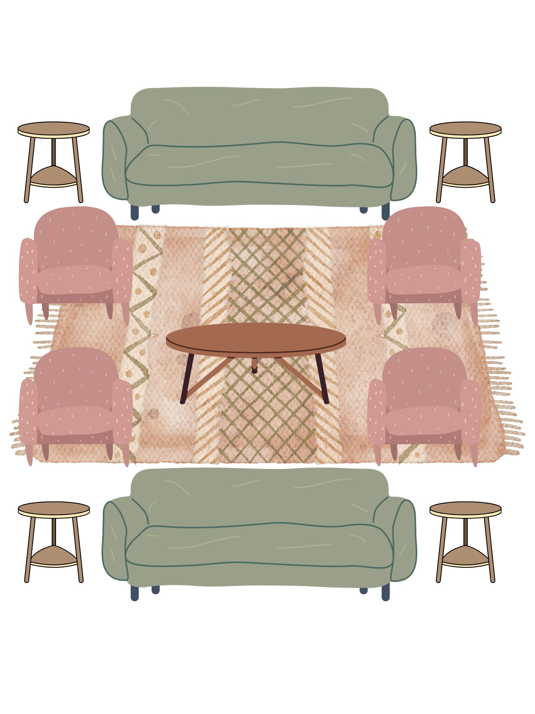Includes two couches, 4 chairs, 4 end tables, 1 coffee table, and 1 rug.