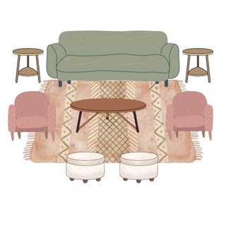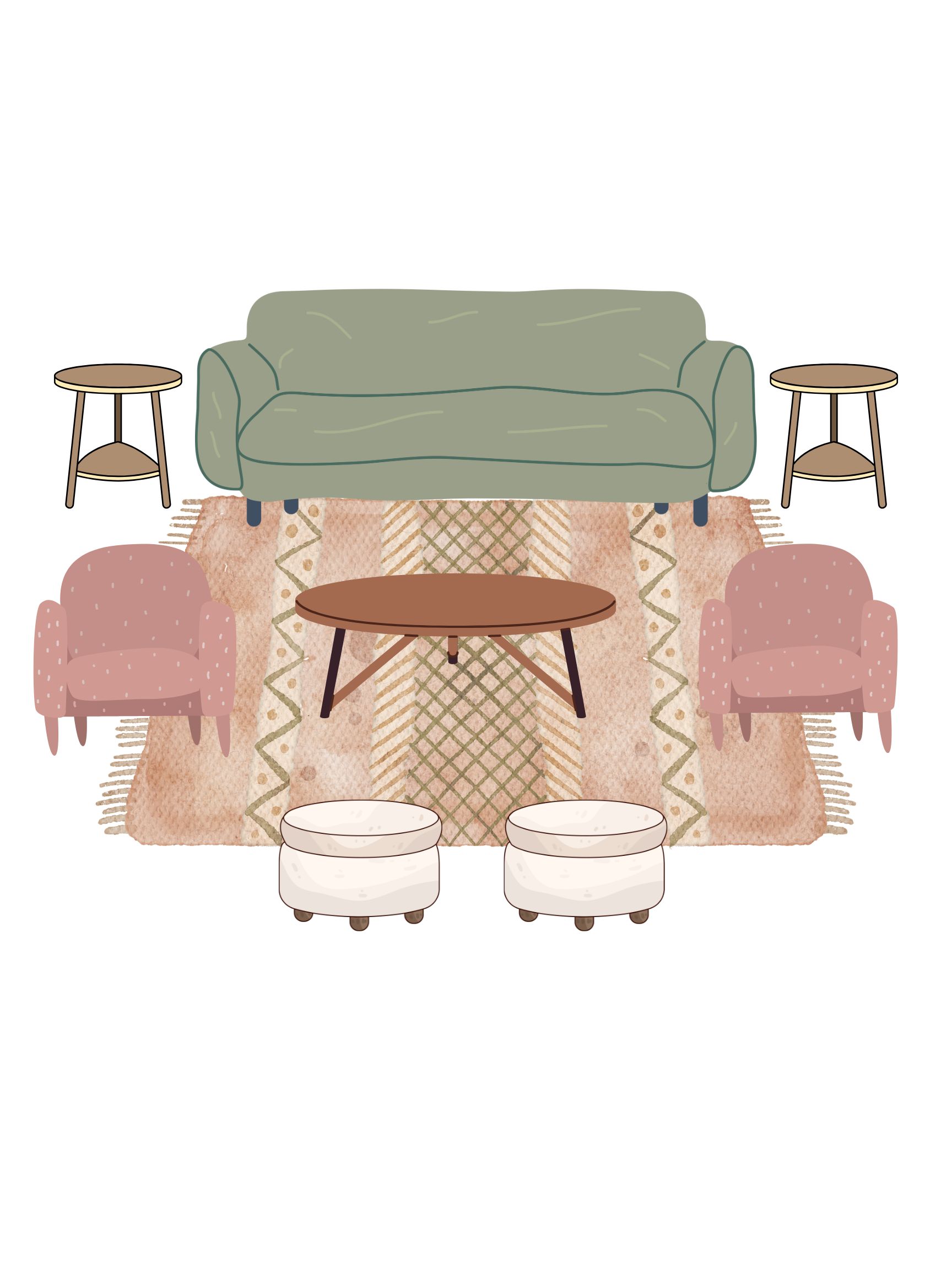 Includes one couch, two end table, one coffee table, two chairs, a rug, and two ottomans.