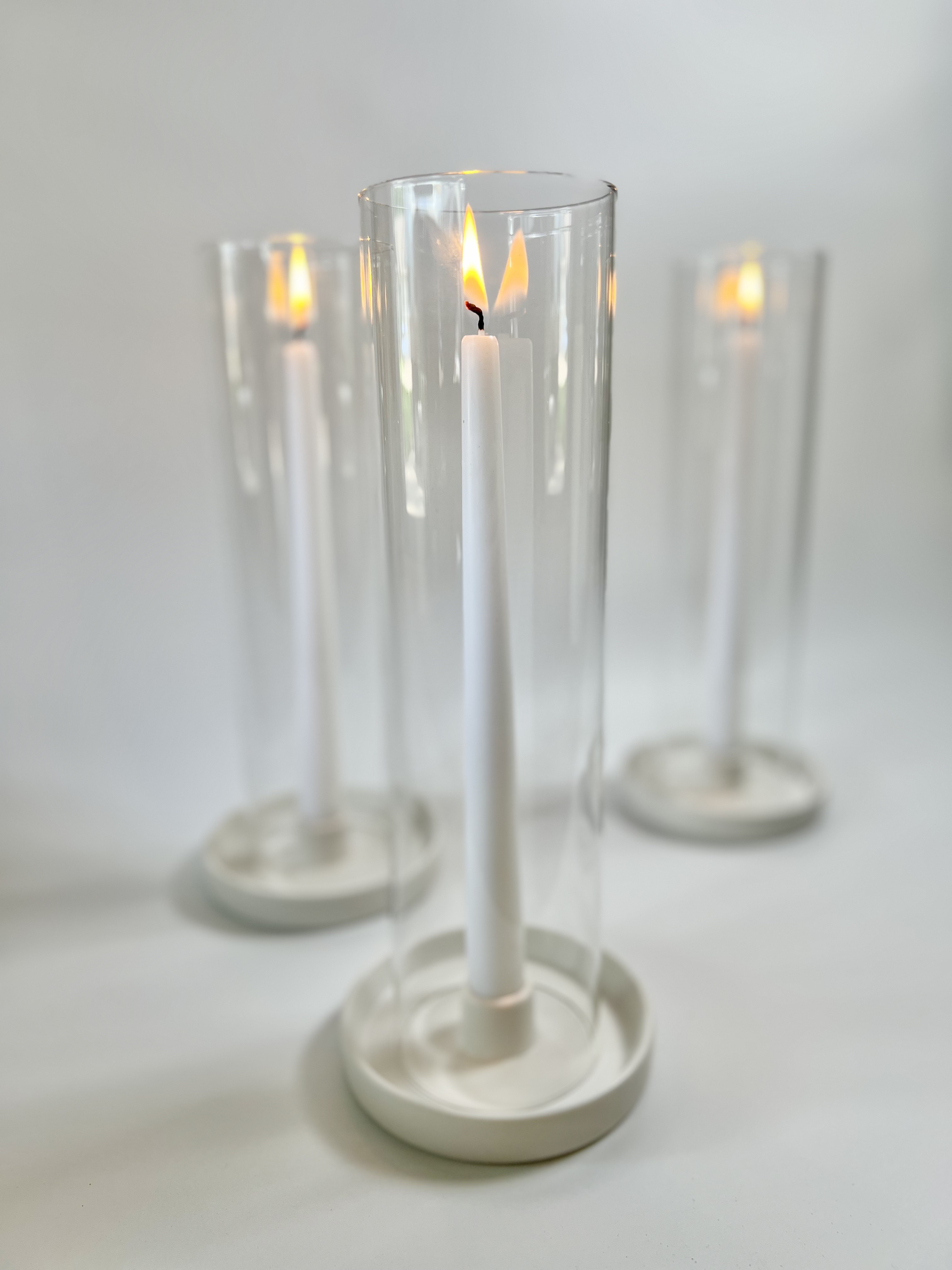 A sleek and contemporary design, these would be the perfect addition for your wedding table. 4.7" inches wide, and the hurricane standing at about 12 inches tall.
