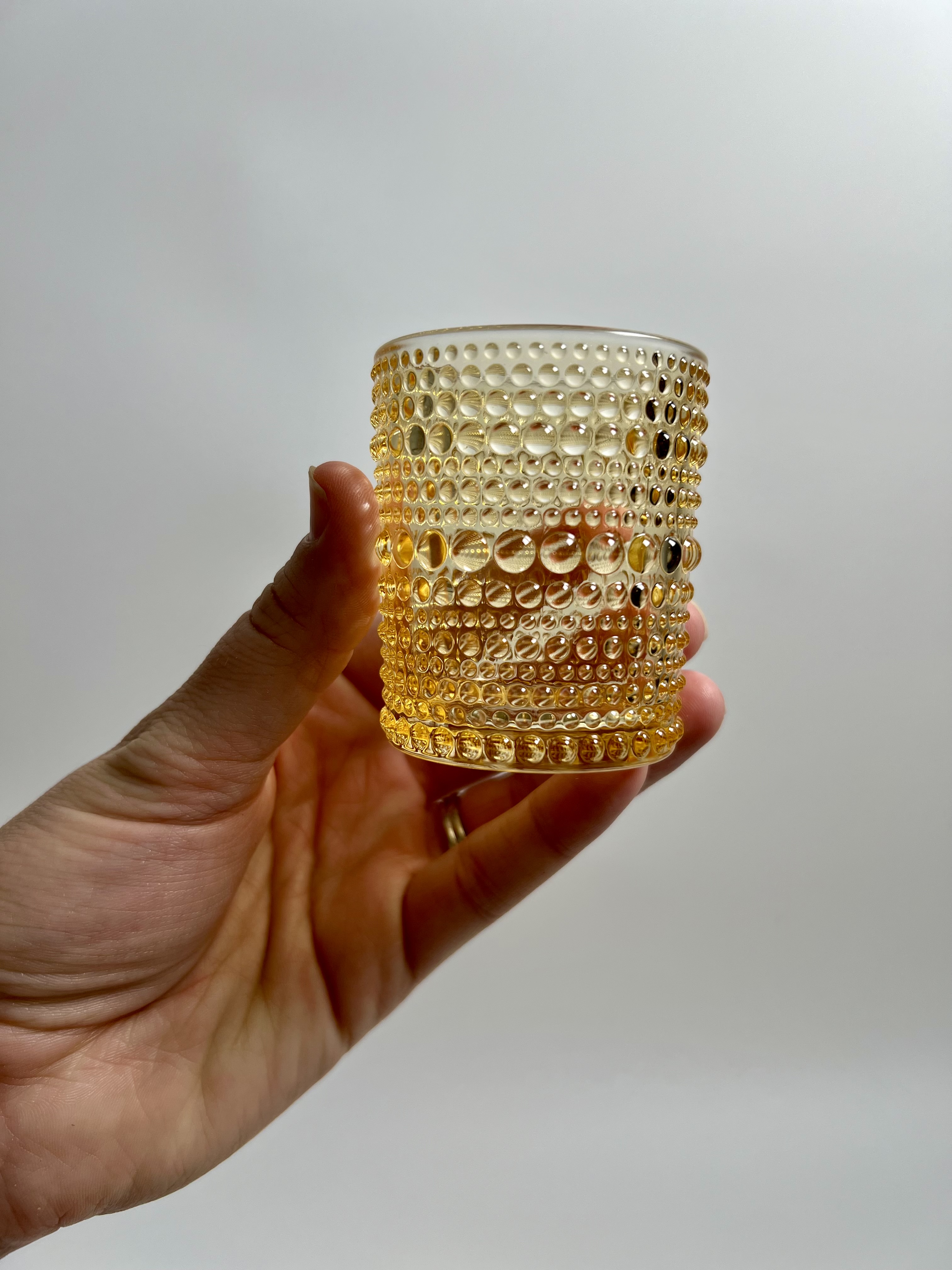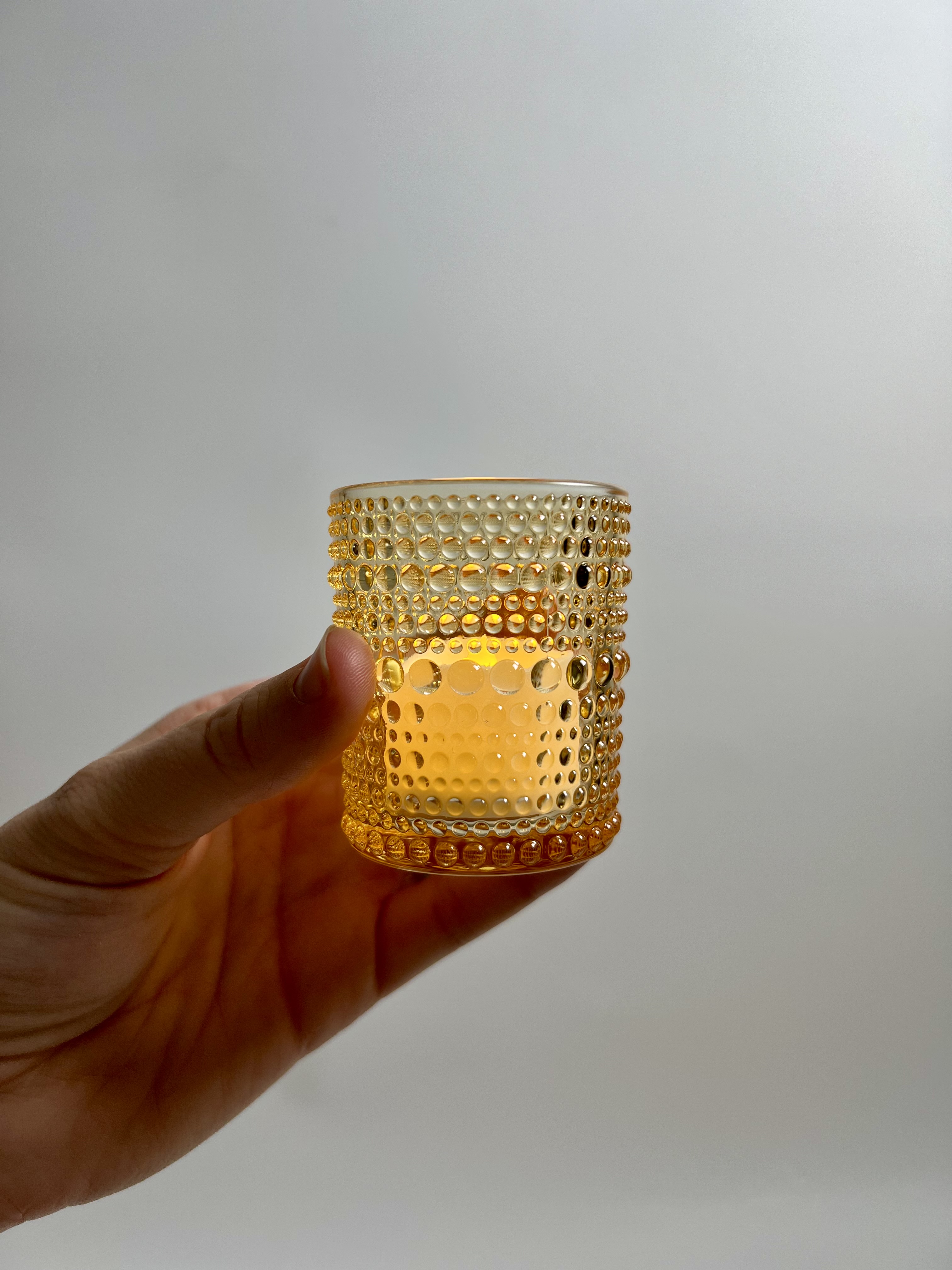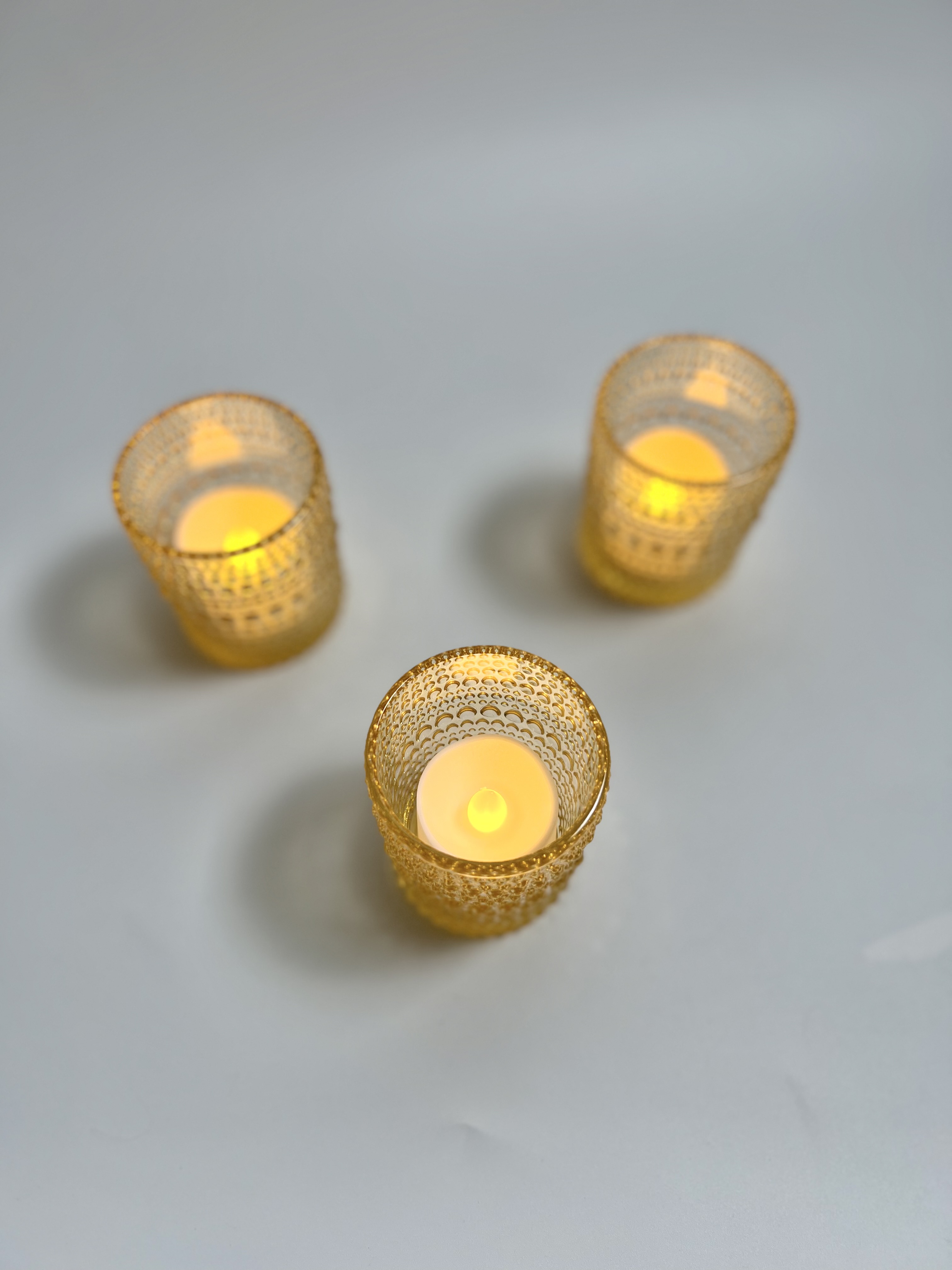 These small Yellow / Gold tea light holders are sure to give a pop of color to your tabletop. 2.5 inches tall, and fits a 1.5 inch tea light.